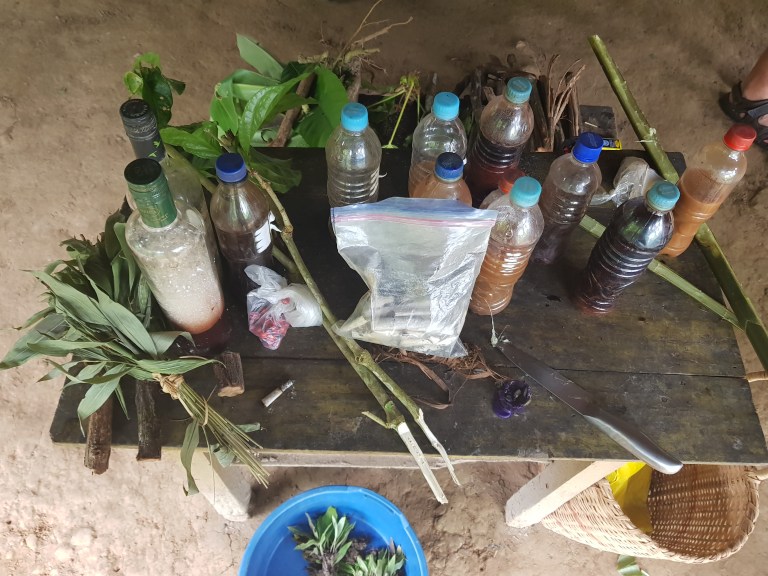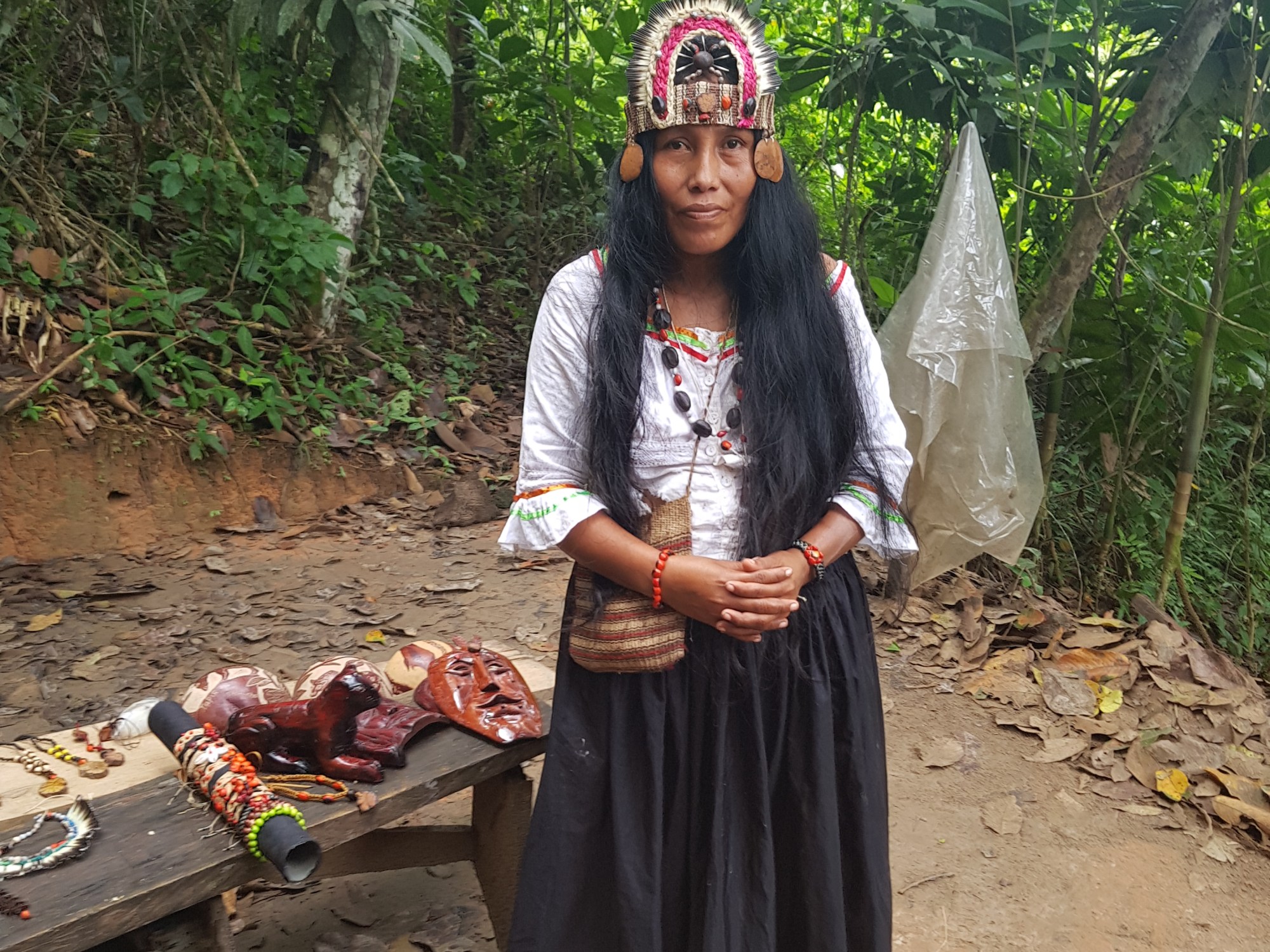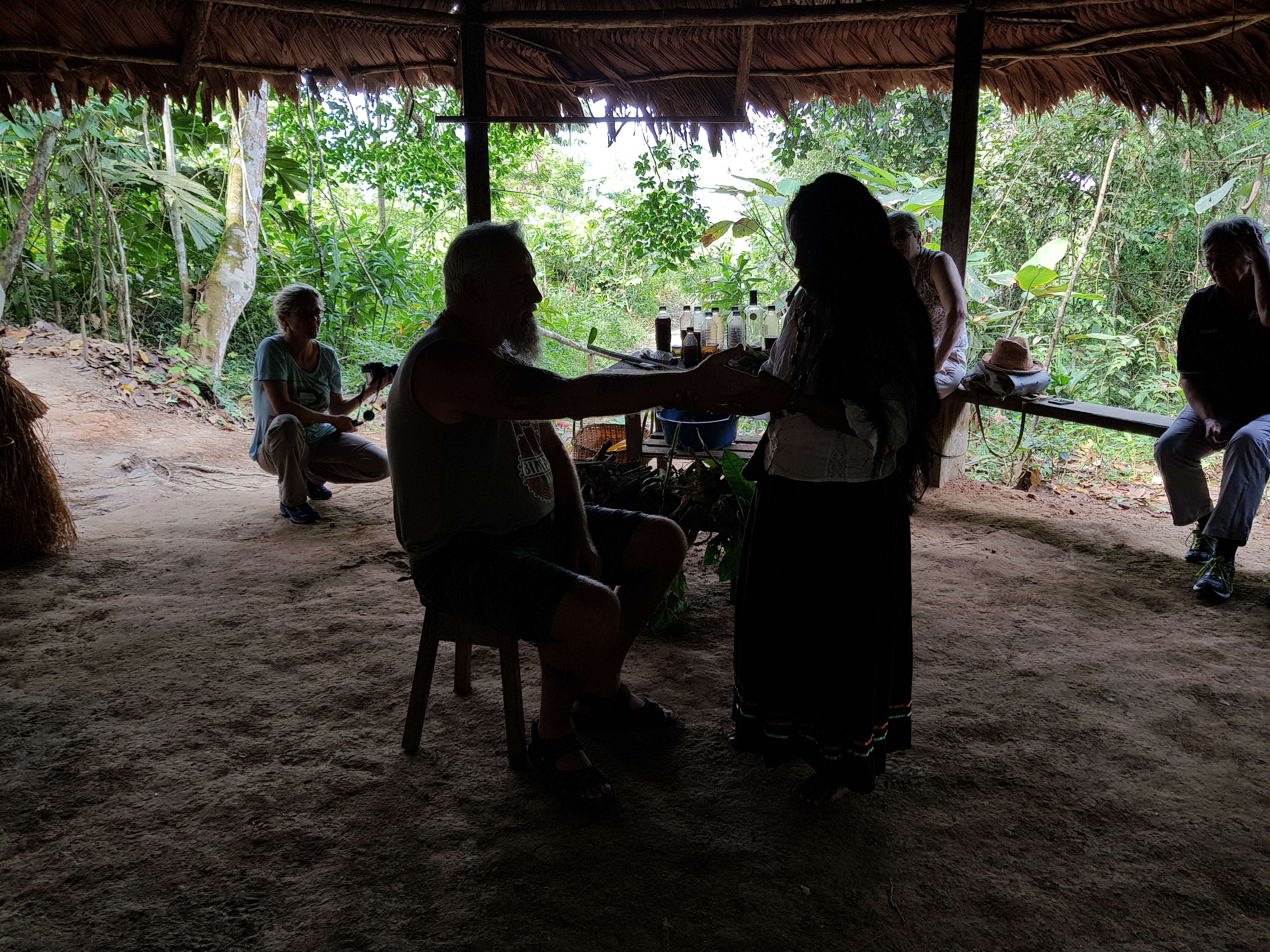 At 09:00 am we leave the ship in the skiff to meet a local shaman. She is not old, has super long hair, mother of two. She learned from her grandfather four years and serves 4 communities. She explains the plants she uses for her rituals. She does mainly analysis, non invasive medicine and rituals against bad karma and curses. And she sells some handicrafts. She cleans Mike with tobacco.