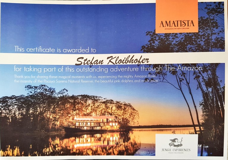 In the evening everybody gets a certificate, that he sailed the amazon. We hug each others, the junkie monkeys play once again on the upperdeck, then we drink and go to sleep.