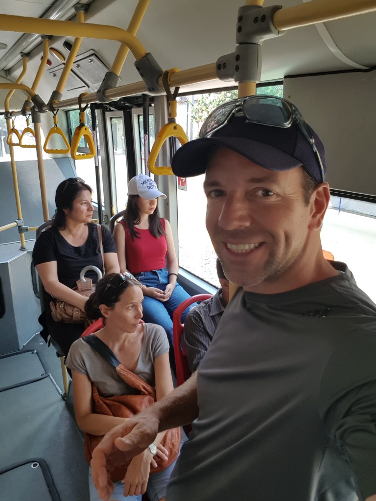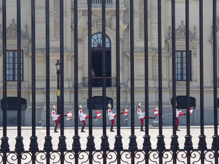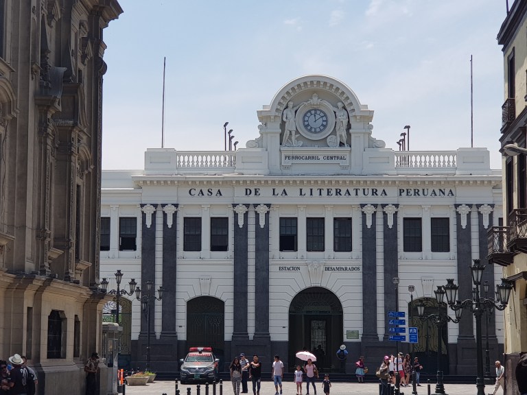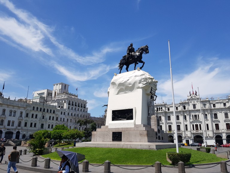 We got back to our hotel, get ready for a day in the city and leave again. We meet the others in the lobby, the go to indian markets in Miraflores. We take the bus to the city center. As we see outside a lot of traditional clothed people at Plaza San Martin, we get off the bus.