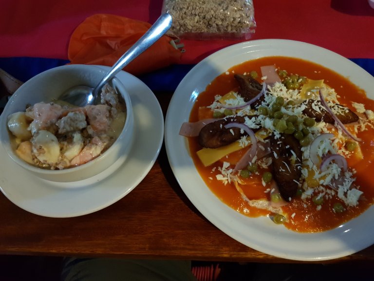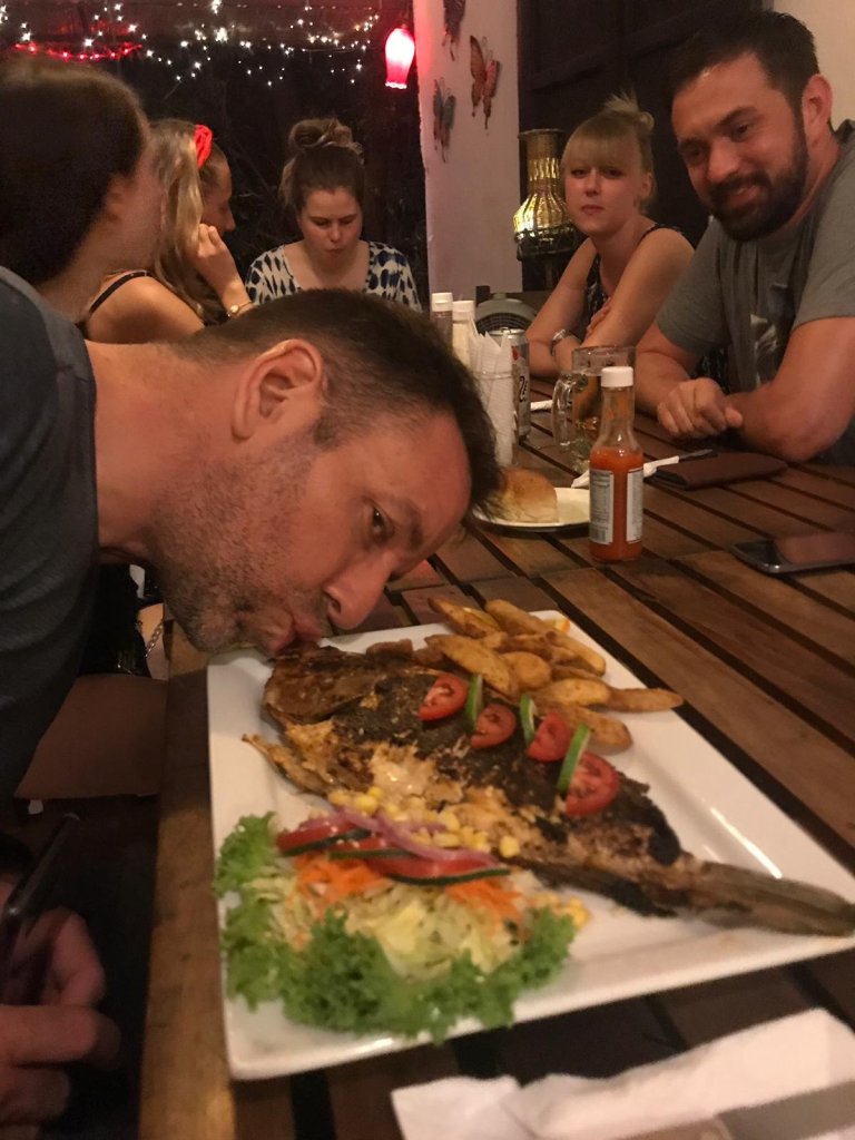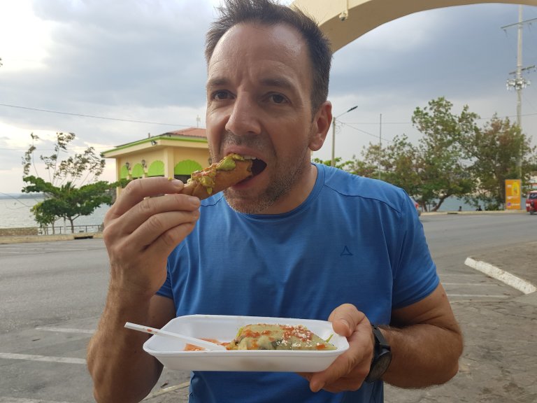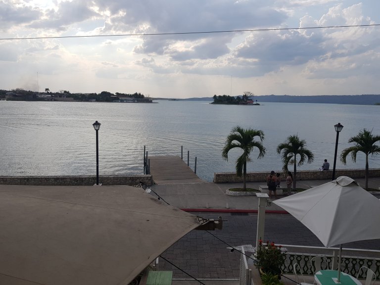 We try to find an ATM which works, not so easy here. The third ATM in a shopping mall over a bridge works. I get 2.000 cezales for 42 cezales charge (267 eur). We try some streetfood, which has a consistency like volcanic stone, then we go back to the hotel for preordered lunch at “La villa del chef”.We get lake fish which is surprisingly good.