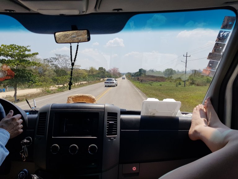 More or less a driving day. We have breakfast at 7:15 am after putting all the things together once more, get lunch packages (a club sandwich) and board the minibus. Then we drive to the border from Mexico to Guatemala.