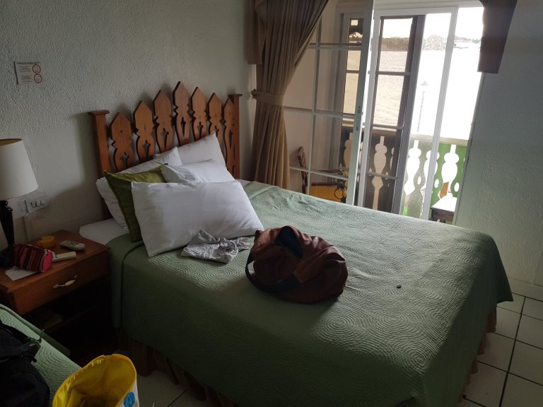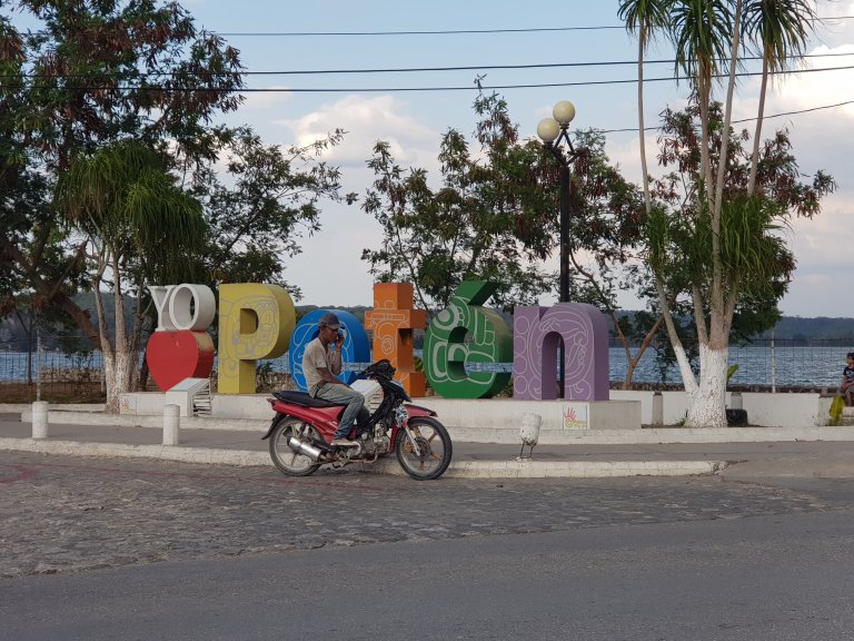 We need to get our luggage out of the bus and carry it by foot over the border. Some forget their backbags, some their jackets, some have their passports in big luggage. Finally we cross the border, Lola does the 10 cezales entrance stuff, we board a bus, which has seen better days and of we drive to Flores. Lola entertains the group.We arrive in Flores and get our rooms in Hotel Peten. The rooms are bed + bath + 1 m2, no place to put the bag.