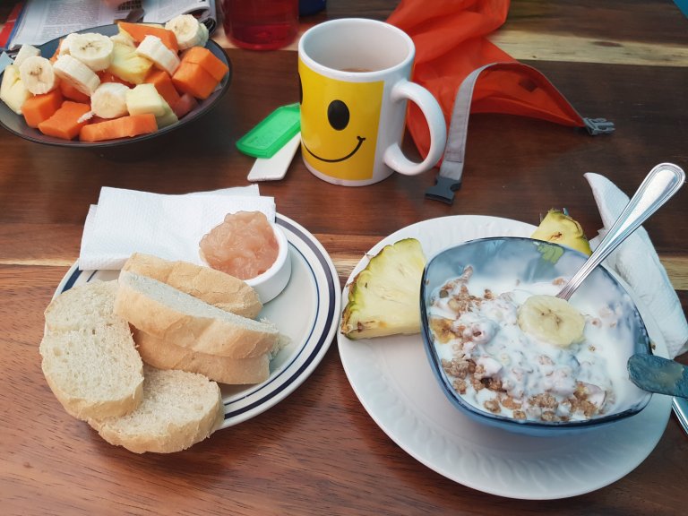 We look for a breakfast place, which serves oatmeal. We walk around the small village until we find a place right next to our hotel (Namaste restaurant). They do smoothies with oatmeal and are flexible enough to just cook it with water. We order oatmeal, fruit bowls, yoghurt with nuts, bread and coconut marmalade, coffee (caffeine, too, nice, they refill), very delicious. The coffee is made of beans. Prices are like in Vienna.