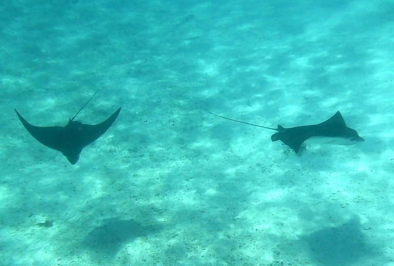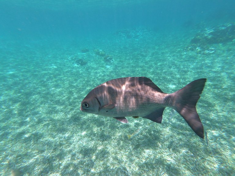 Then Captain Slain brings us to the first coral reef, tells us 20 min before arrival to put on sun screen and we snorkel. Life vests are optional.I go with the group, able to swim. Suoer clear blue water, very little drift and waves, shallow water. Lots of fish, intact corals (unexpected, they put everybody into the water, regardless if the are able to swim or snorkeled before.