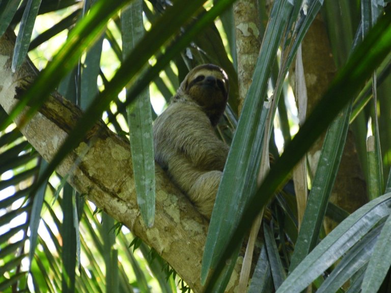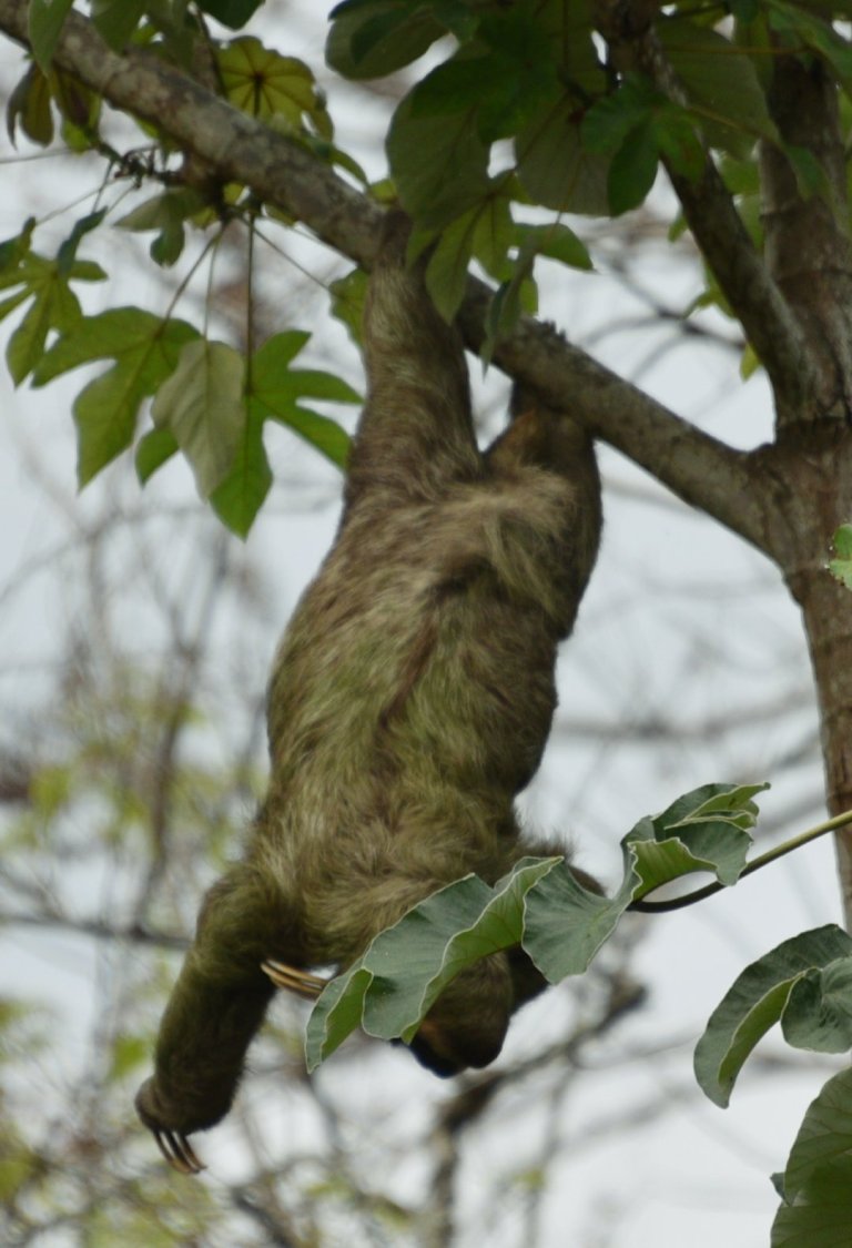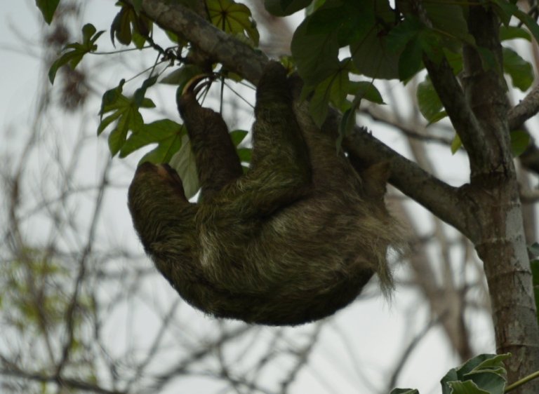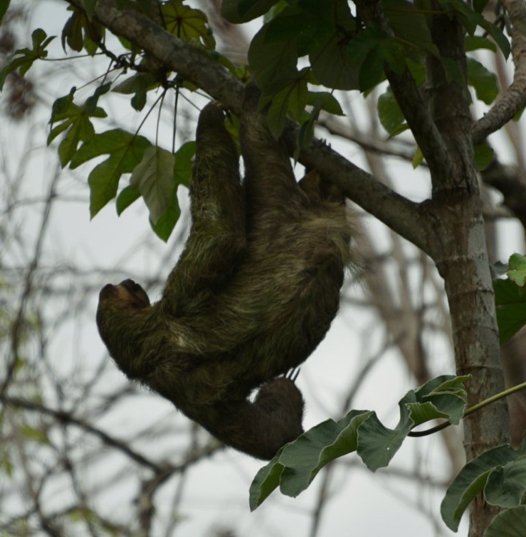 Three toes sloth. His vertex is on his belly to let rain water flow away easier. It lives on ant-trees. In its four a certain kind of bacteria and seaweed. The seaweed is the nutrition for a moth. This bacteria an moth identifies the sloth to the ants of the tree as friend. If a jaguar comes, to eat the sloth, the ants will attack the jaguar and therefore protect the sloth.