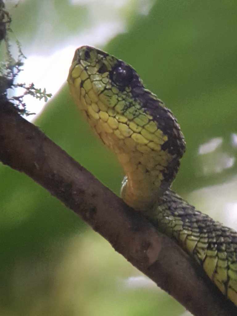 The guide spots a super tiny green snake. I cannot see with free eye. With the binocular I can.