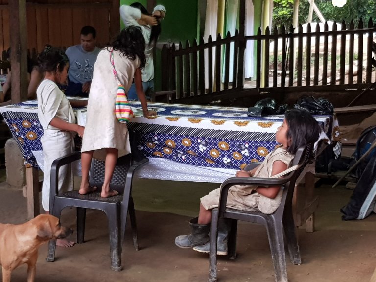 We start to walk at 06:00 am to go up 1.300 steps to la Ciudad Perdida. Indigenous kids play with the travel agents books.