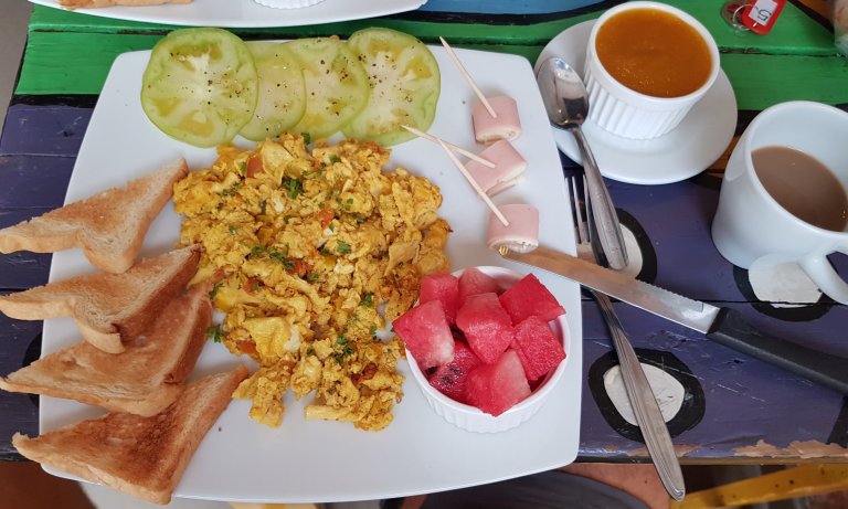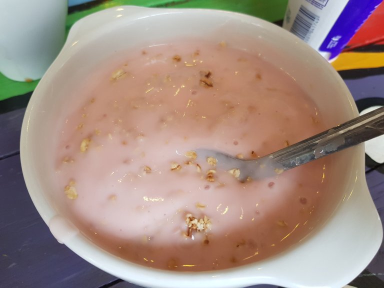 We are, with a german boy, the only guests in the hostel. Breakfast is served in the small bar, cereals and a breakfast plate.