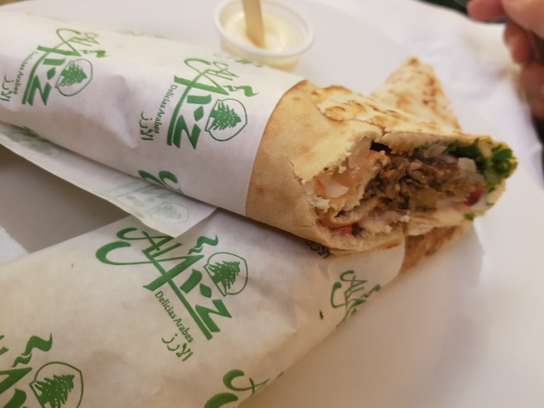 I go to the supermarket for water and yogurt, then to the hostel, then for dinner to the Arab restaurant, which is TripAdvisor number one here. Al Arz Delicias arabes. A Lebanese guy who does amazing Lebanese food.