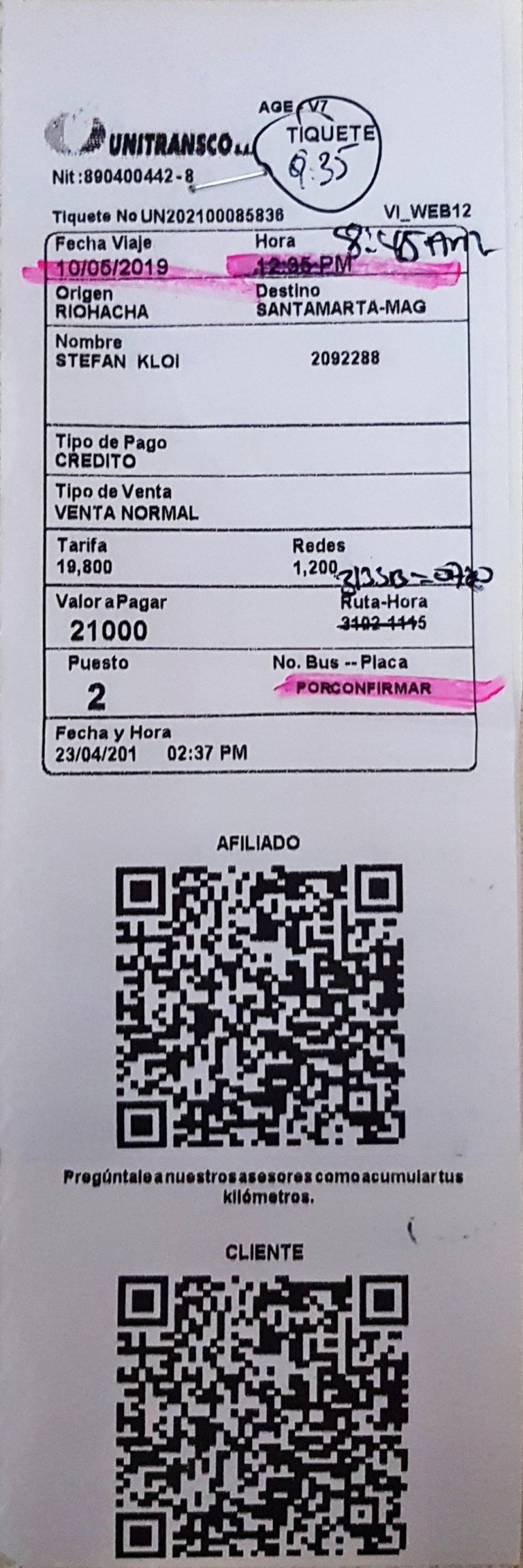 I walk to the bus station to try to switch my bus ticket to morning instead of late afternoon. Better same time in Santa Marta than in Riohacha. It is a little bit complicated. They donot understand English and cannot read Google translate. In the end I leave with this ticket and have no glue when my bus leaves.