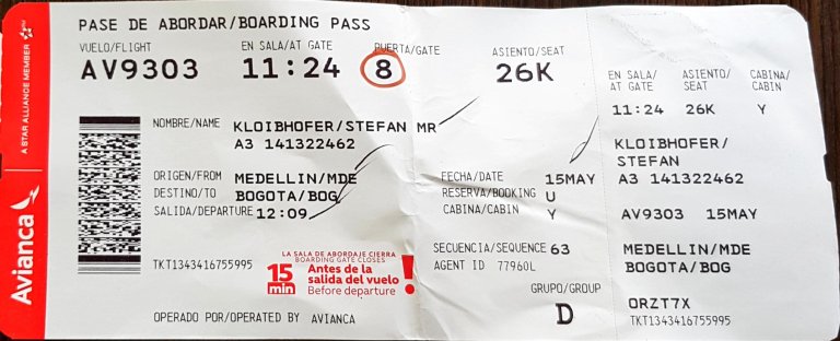 FLIGHT 9: 15.05.2019 Avianca AV9303 Medellin (MDE) 12:09 – Bogota (BOG) 13:06; flight time 0h57m;