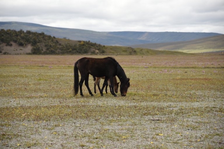 Then we drive to Laguna limpiopungo at the foot of the Cotopaxi. There are wild horses, we get out of the car and walk an hour around the lake.