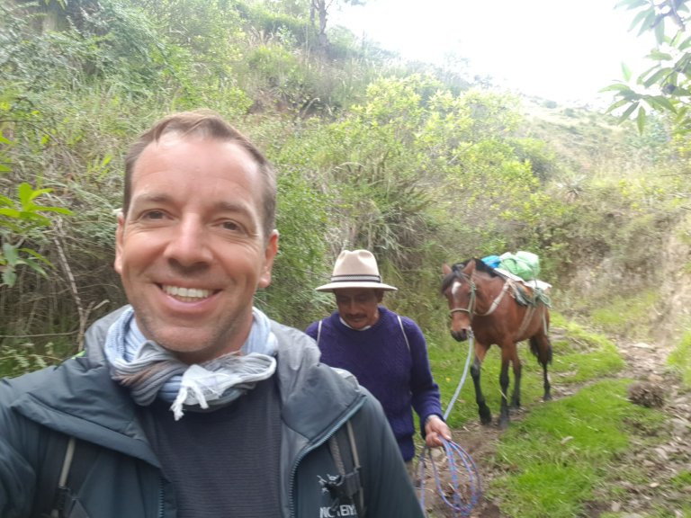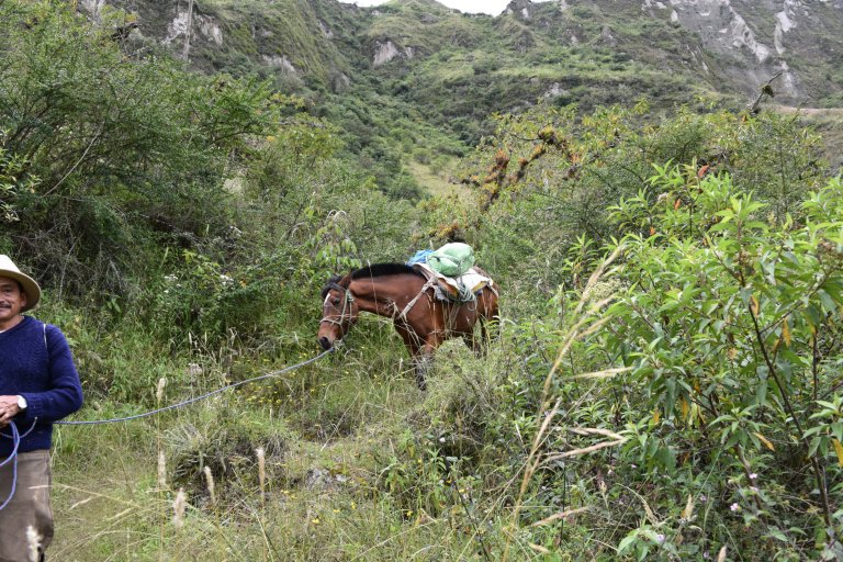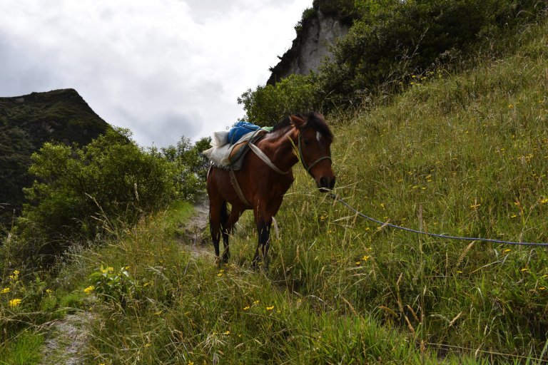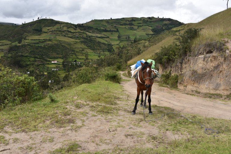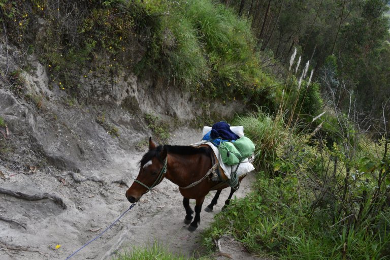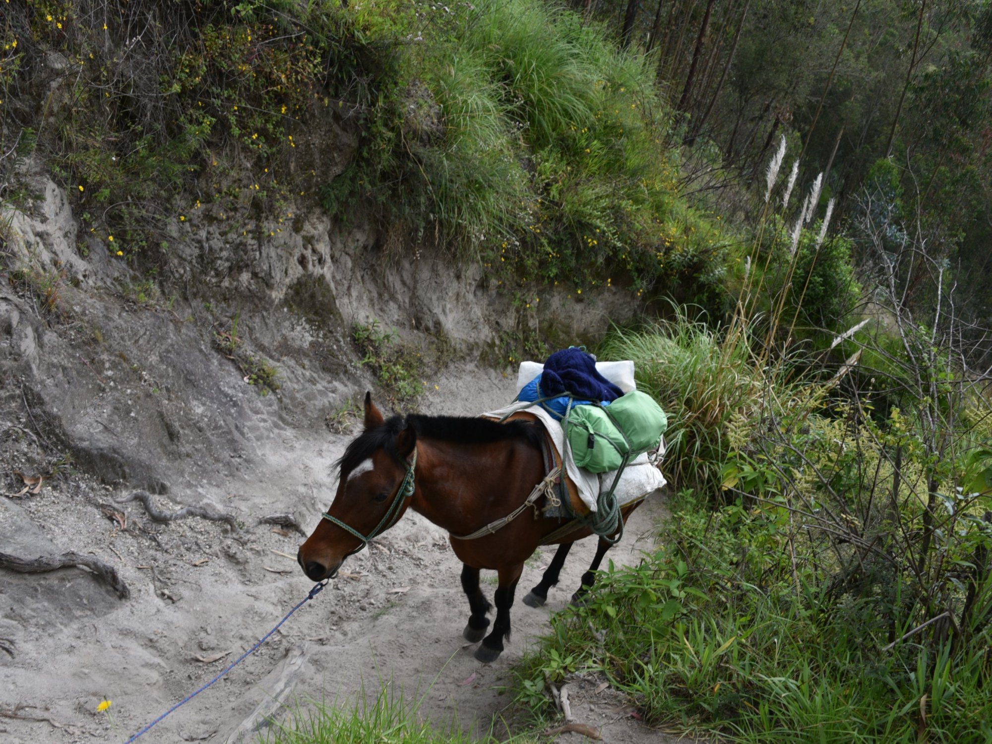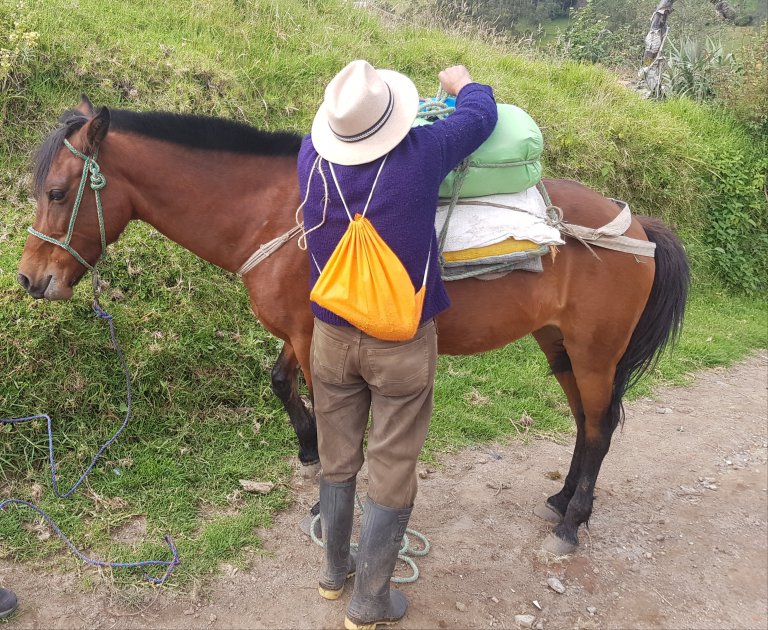 After breakfast I get my lunch box (sandwiches, fruits, orange juice, sweets). I put the stuff I donot eat in the side pockets of my backpack for the local kids. I pay and meet my guide Francisco. He doesnot speak English, but some words German. He takes my base luggage sack and ties the sack on his horse. He definitely was no boy scout.