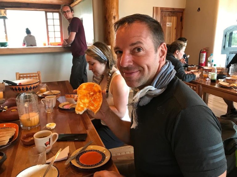 Night is cold. My fire keeps me warm. I get up and open the curtains, wonderful view, wonderful weather. I go for Llullu Llama breakfast.