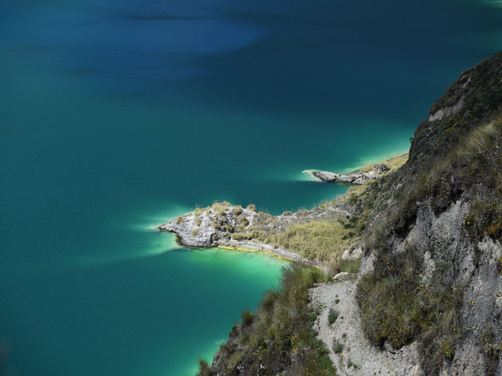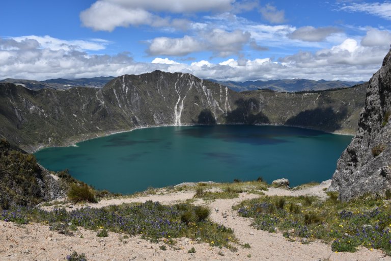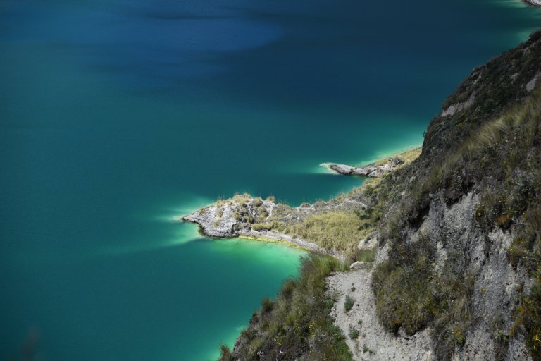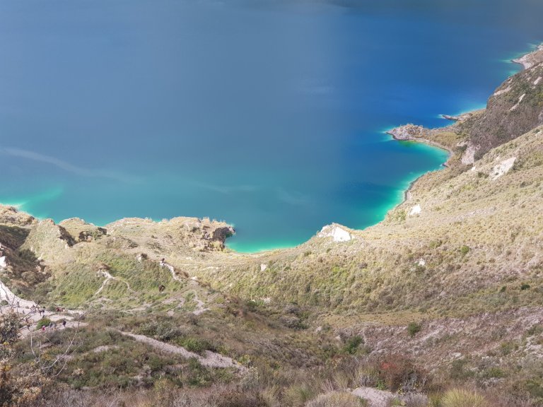 Trek from Chugchilán to Quilotoa lake. The Quilotoa lake is a volcanic crater lake that, according to geologists, is 250 meters deep. The lake is beautiful and has a special green color due to dissolved materials. It is possible to walk down from the rim to the lake. Take into consideration that if you walk down, you have to climb up as well. It is quite steep and it will cost some time an energy to climb up. It is possible to rent a horse that will take you back up. However this dies not go very fast since the horse s stop every few minutes.