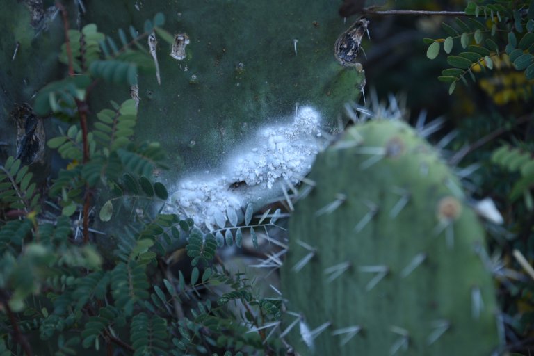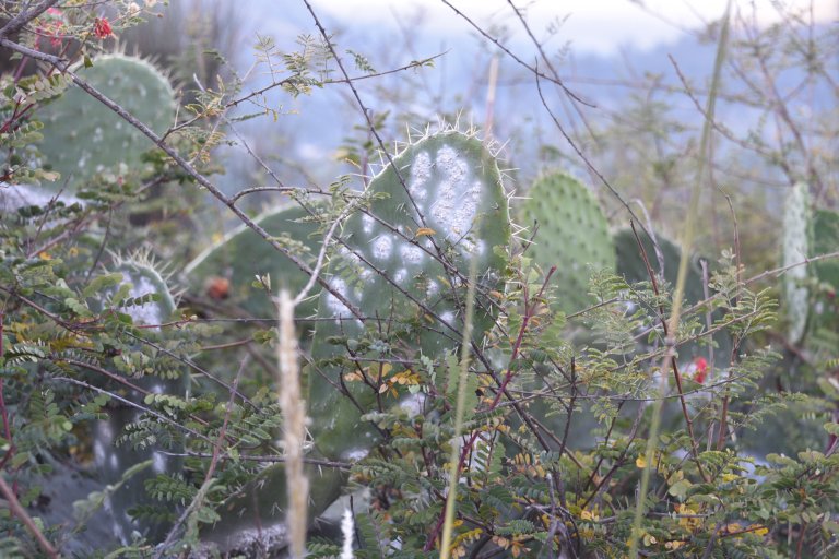 There is cactus with a worm, living on it. The worm is red and traditionally use for coloring fabric and food.