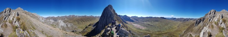 After a steep climb we reach Cacananpunta Pass at blue sky. It is freezing cold and windy.