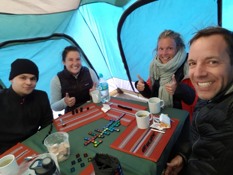 I crawl out of my sleeping bag and put my stuff into the huge duffle bag again. At 06:00 am Karina, the assistant hiking guide opens the tent and gives me a cup of hot Koka tea. Short afterwards they bring a small pot with hot water. I was my face, change to hiking gear, keep just the rain gear, food, water, camera in my daypack. I brush my teeth. Hopefully the electric toothbrush keeps power for 8 days. Then I put my duffle bag out on a plastic and take my daypack to the breakfast tent. Blue sky.