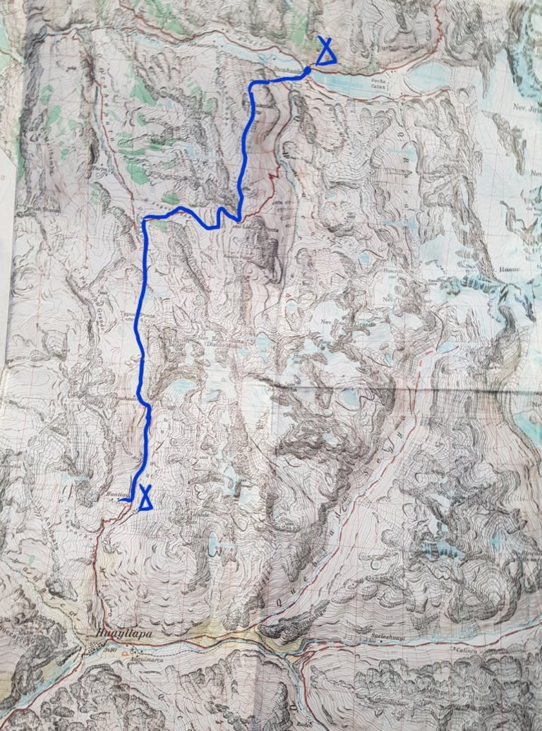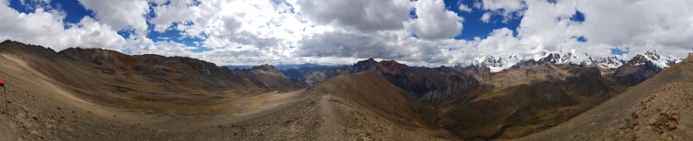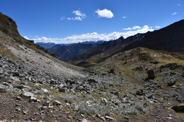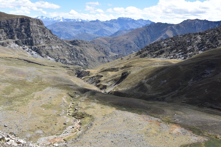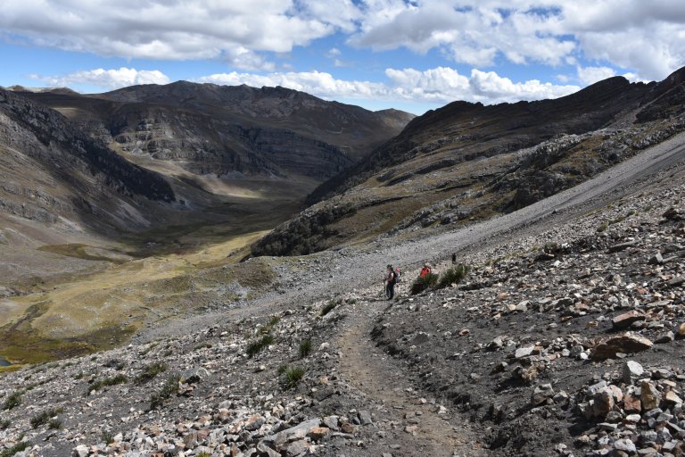 Then we have to decide, go down in the valley to the river and follow it to the campsite or optional climb up once more to the rim opposite Huayhuash, walk on the rim and later go very steep down. We decide to optional and go up once more. Only half of us does.