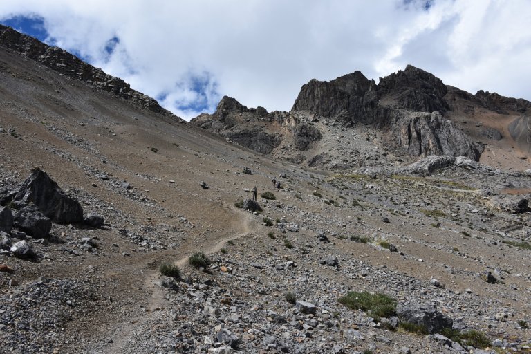 We reach the pass and look into a slow descending valley. We make a break. Nobody takes off a layer. The girls look for stones, big enough to hide behind them for baños stop.