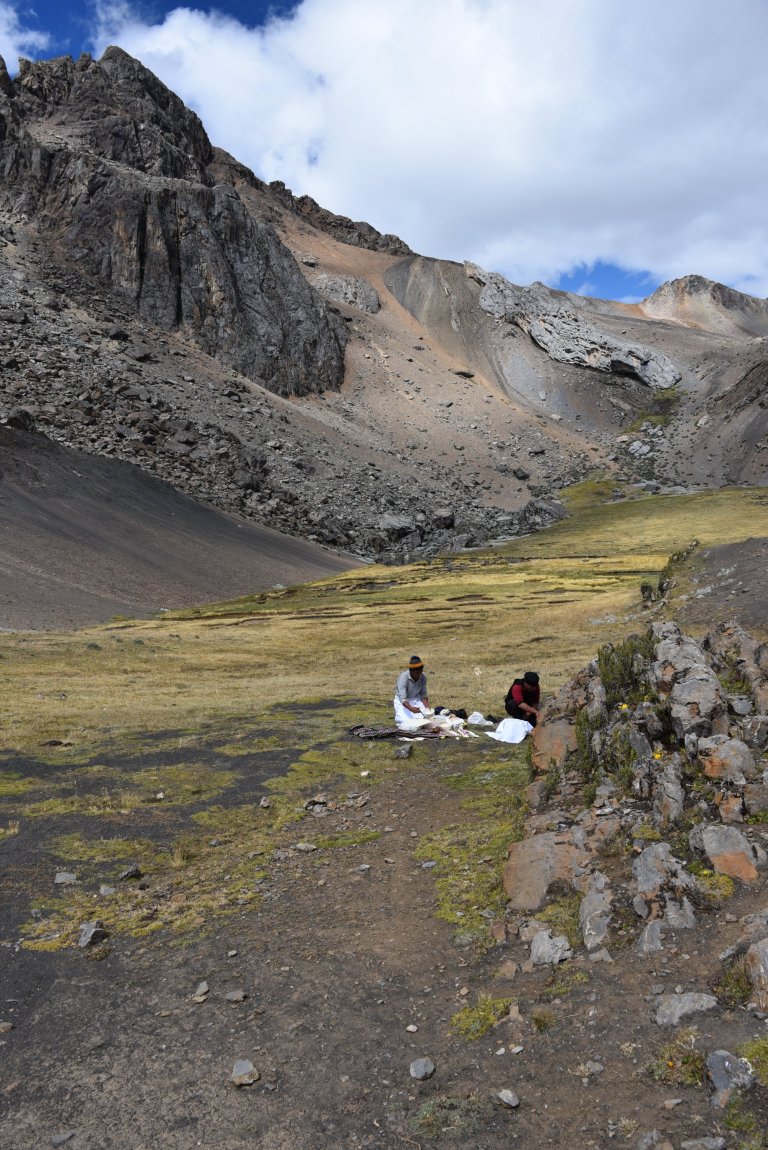 We stop beneath Yaucha Pass in the Lee of the pass to have lunch. There is cellphone signal. Good signal. Even fast (H+) data connection. Sad faces. Most people have their cell phone in the Llama duffle bag. I am continuously vibrating. I send WhatsApps home.