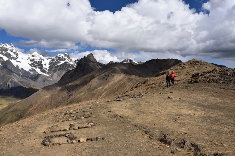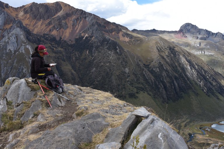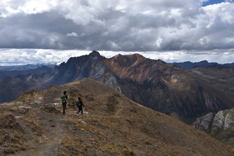 Lucy runs up. After a short but steep ascent we reach the rim. Breathtaking views on cordillera huayhuash are the reward.
