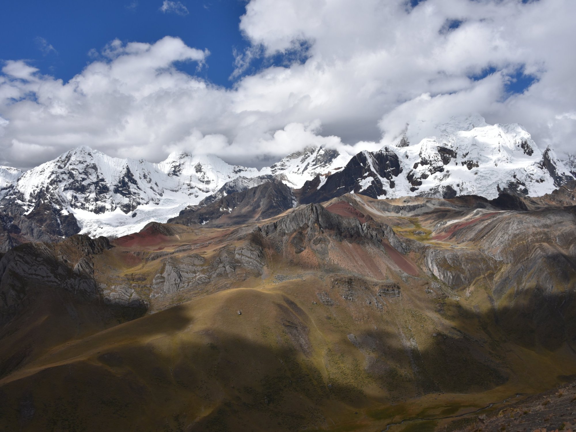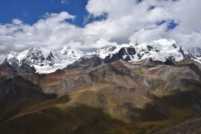 The higher we get, the more the rain turned into snow and stayed, where the shadow is. Colors are wonderful in the sun. The different minerals color the lakes red, brown, blue or green.
