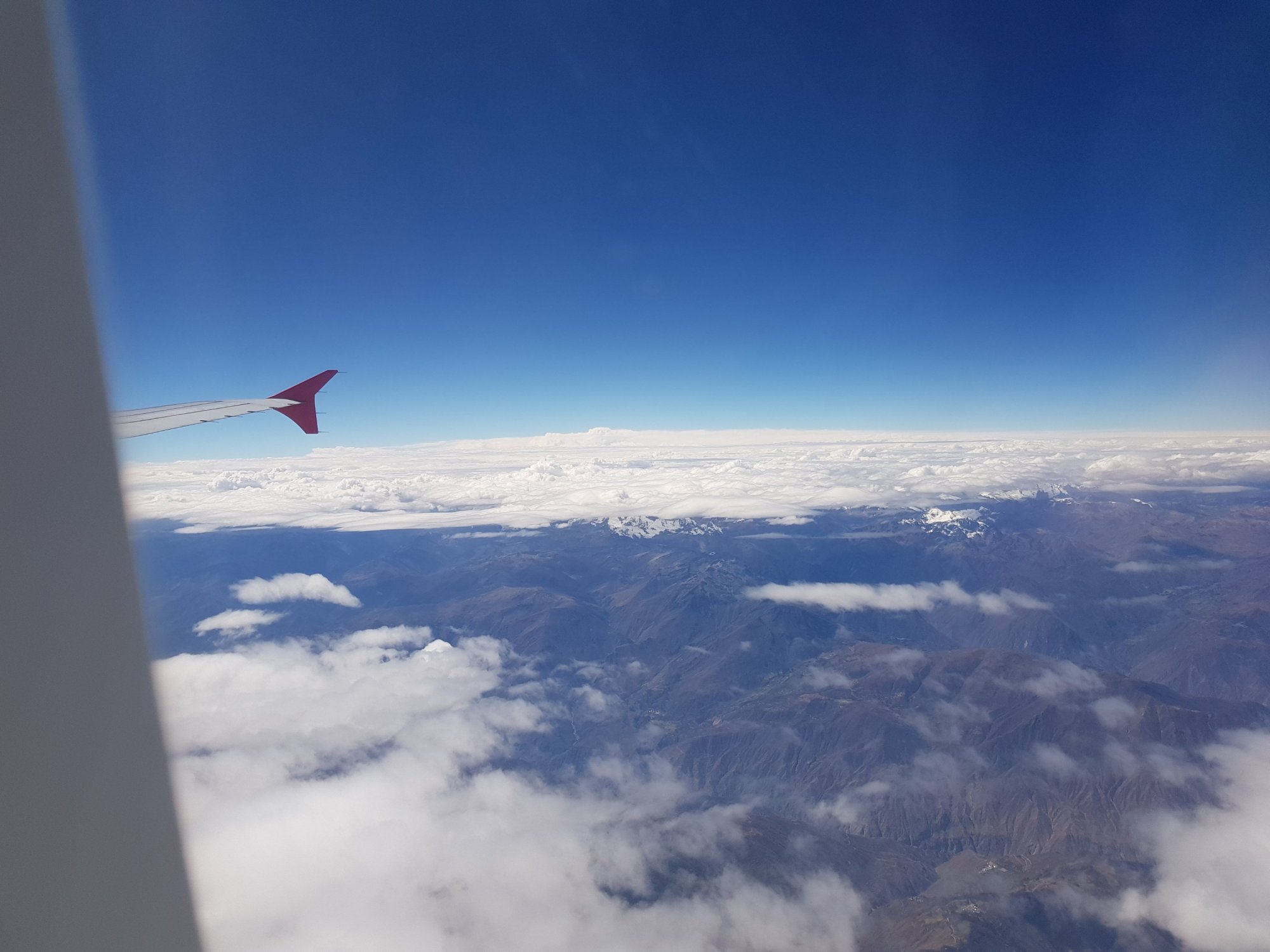 Beautiful flight up north over the Andes. Unfortunately a little bit cloudy, but I could see the tops of huayhuash and Cordillera Blanco through. The plane is half empty, I have the middle seat free and watch the final episodes of American gods.