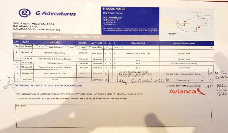 There I have my G adventures CEO briefing for the Galapagos trip. I get an itinerary in which i fly home to quito after nine days, stay two days in hikton colon and fly to Galapagos again. I tell the guy that I willnot do so. He is helpless. I go to call my travel agency.